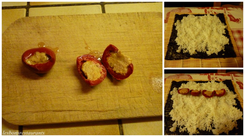 -200g de riz à sushis (voir la recette sur ce lien) -2 feuilles de nori -un bocal de petits poivrons farcis -un bol d'eau légèrement vinaigrée -une natte en bambou