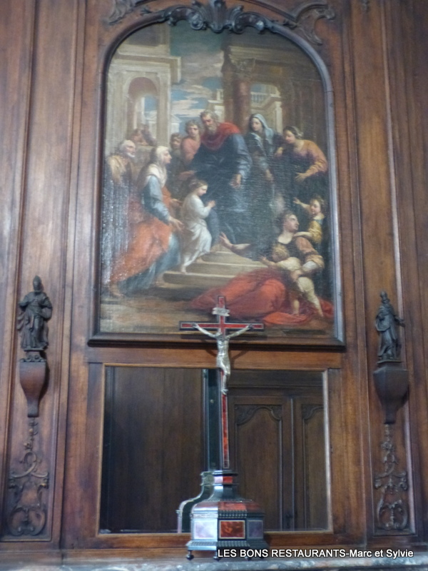Cette série de huit ex voto datent du 17e siècle. Ils ont été offerts à la Vierge en remerciement de la guérison d'un enfant. Ce banc coffre a été réalisé en chêne et date de 1664.
