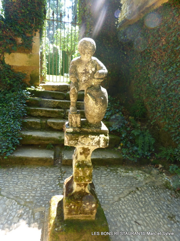 Il est devenu le symbole des jardins! Dieu repose son pied sur un sablier qui égrène les heures et les jours. Il s'appuit sur un vase funéraire qui représente la mort. Il tenait une torche qui représentait le flambeau de la vie. La visite continue...demain!