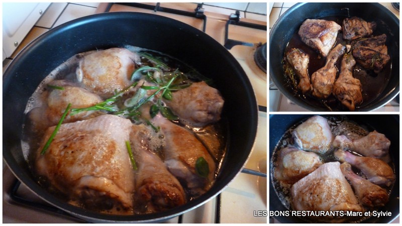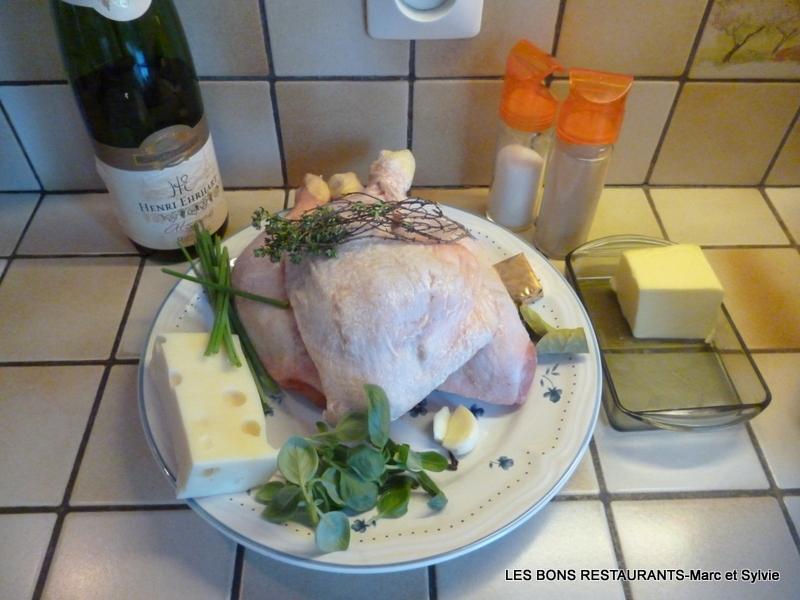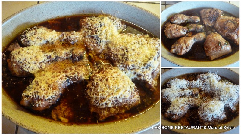 (3 personnes- préparation 10 minutes- cuisson 1 heure) -3 cuisses de poulet -1 verre de vin blanc -1 verre de bouillon de volaille -200g de fromage râpé -beurre -sel, poivre -clous de girofle -thym, laurier, basilic, ciboulette, ail Coupez les cuisses de poulet en deux.