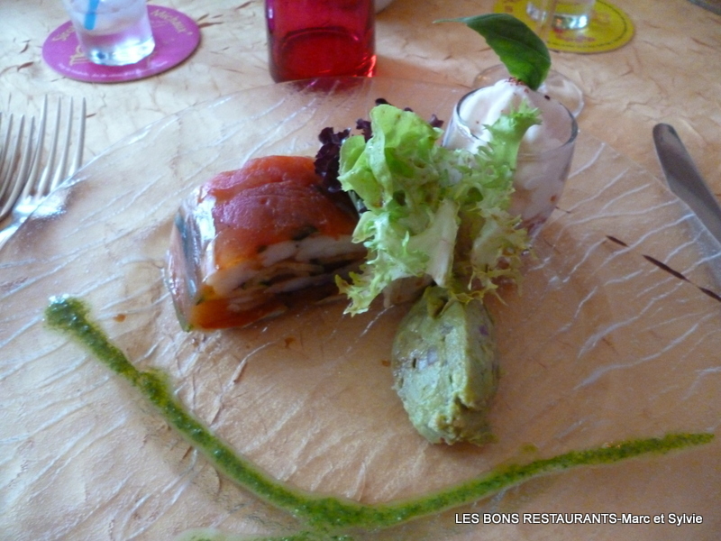 En entrée Marc choisit de goûter au pressé de gambas, tomates séchées, pois gourmands et granité Bloody-Mary.