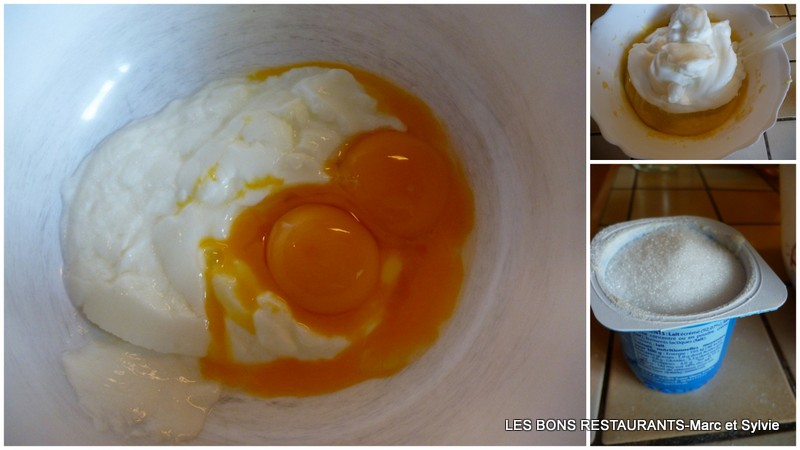 Versez-y le yaourt. Ajoutez-y les jaunes d'oeufs et mélangez. Versez la farine, la levure, le sucre, l'eau de vie de mirabelle et l'huile. Monter les blancs en neige et incorporez-les à la préparation précédente.