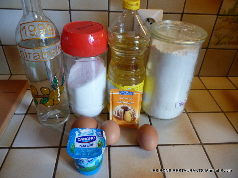 (8 personnes- préparation 15 minutes- cuisson 30 minutes) -1 yaourt -1 paquet de levure chimique -3 oeufs -2 pots à yaourt de sucre -3 pots à yaourt de farine -1 pot à yaourt d'huile -5cl d'eau de vie de mirabelle Prenez un saladier.