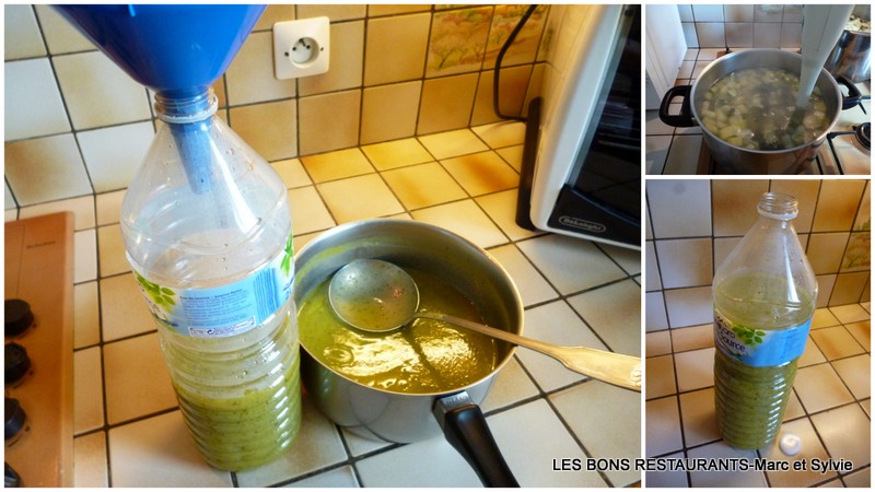 L'idée du jour est de réaliser une grosse marmite de soupe afin de la congeler! L'étape du fromage et de l'oeuf sera réalisée à la dernière minute, au moment de la dégustation! Lorsque la soupe est prête, vous la laissez refroidir, puis vous en remplissez des bouteilles d'eau à l'aide d'un entonnoir!