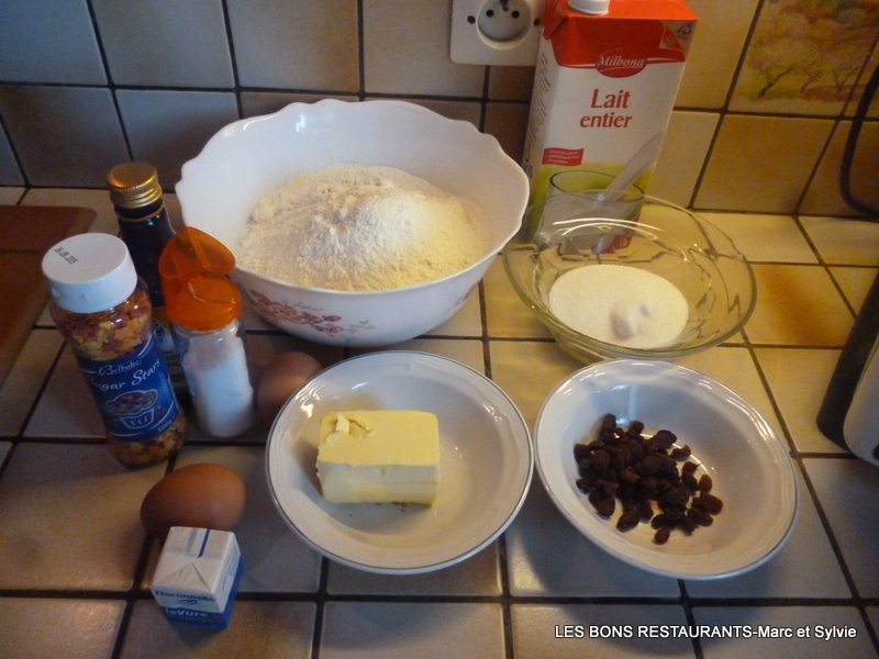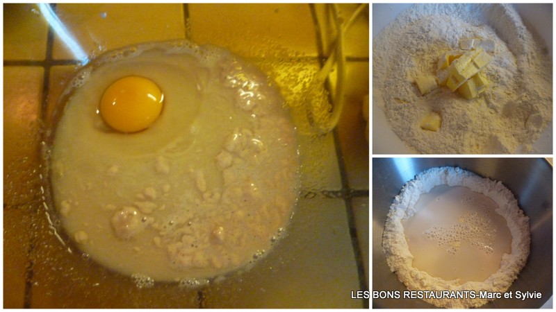 Délayez-y la levure de boulanger avec 4 cuillères à soupe de lait et le sucre. Ajoutez l'oeuf et battez le tout. Ajoutez le reste de lait et mélangez Mélangez le sel et la farine dans un grand saladier. Incoporez le beurre coupé en dés du bout des doigts. Faites un puits dans la farine. Ajoutez-y le mélange lait/oeuf. Pétrissez jusqu'à l'obtention d'une pâte qui ne colle pas. Ajoutez quelques cuillères de farine si nécessaire. Pétrissez la pâte à la main sur le plan de travail fariné afin d'obtenir une pâte plus résistante.
