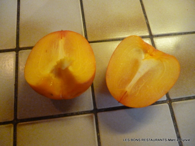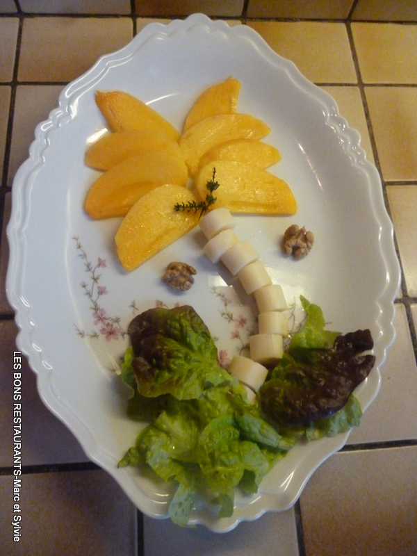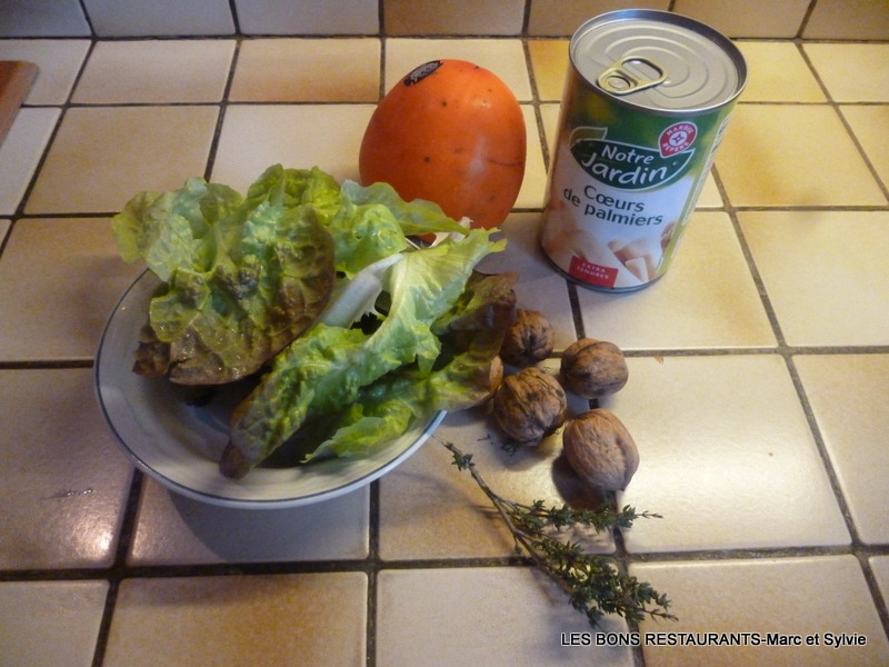 (4 personnes- préparation 5 minutes) -1 boîtes de coeurs de palmier -1 kaki -quelques feuilles de salade -3 ou 4 noix -un branche de thym -une petite vinaigrette Lavez, pelez et coupez le kaki en fines lamelles.