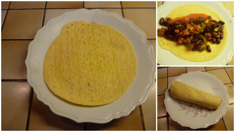 Quand il sont dorés, réservez-les. Faites revenir le boeuf haché et les oignons pelés et hachés. Ajoutez les poivrons lavés et finement coupés, le chorizo, et les lardons. Ajoutez les tomates pelées, le maïs, la poudre de chili, le paprika et l'origan. Laissez cuire 5 à 10 minutes. Terminez par le concentré de tomates, 1/2 litre d'eau et les haricots rouges. Couvrez et laissez mijoter 30 minutes. Faites chauffer les tortillas comme indiqué sur le paquet.