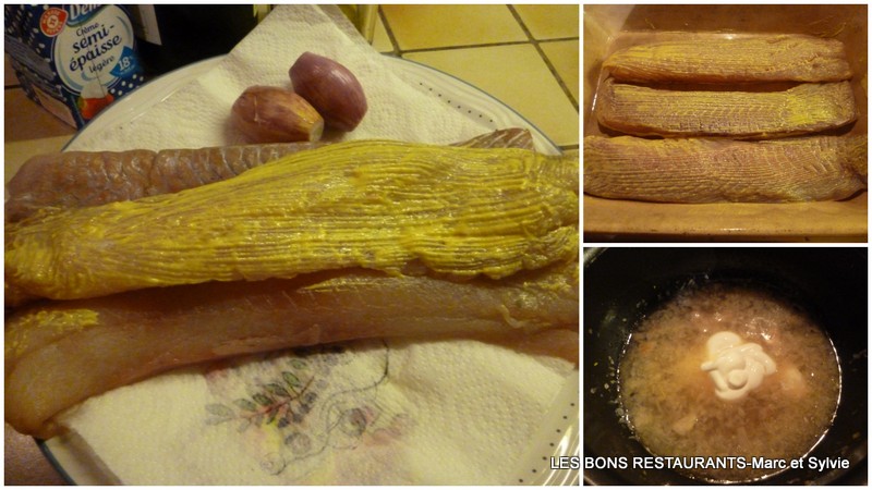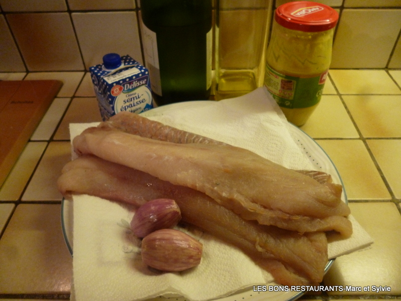 (4 personnes- préparation 15 minutes- cuisson 20 minutes) -2 dos de lieu noir -2 échalotes -20cl de vin blanc -10cl de crème -2 càs de moutarde -huile d'olive Pelez, lavez et hachez les échalotes.