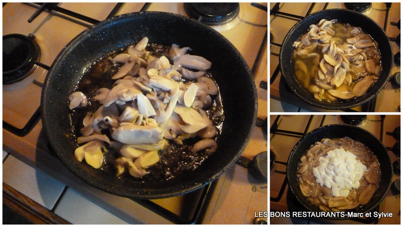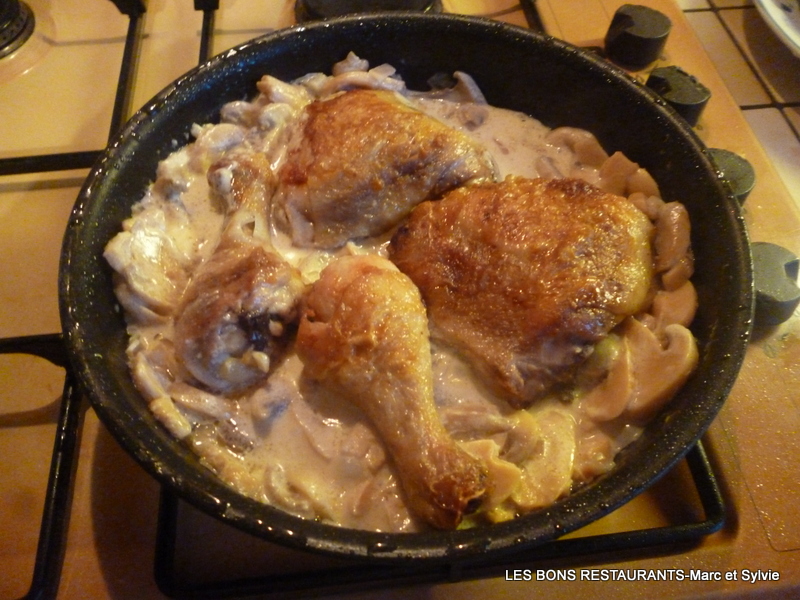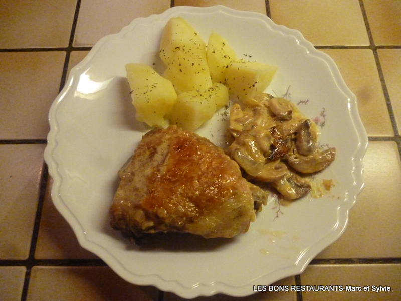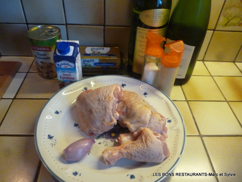 | Quelques ingrédients...poulet, champignons, crème....et hop suivez-moi en cuisine! Aujourd'hui, je cuisine du poulet à la crème et aux champignons! Les ingrédients pour cette recette: (4 personnes- préparation 20 minutes- cuisson 1 heure) -2 belles cuisses de poulet coupées en deux -200g de champignons égouttés -1 échalote -30g de beurre -3 càs d'huile d'olive -20cl de vin blanc -20cl de crème fraîche -sel, poivre Salez, poivrez les morceaux de poulet. Faites chauffer le beurre et l'huile dans une sauteuse. Faites revenir le poulet et laissez-le rissoler 15 minutes sur feu doux. Réservez! Remplacez le poulet par les champignons. Faites-les sauter à feu vif 5 minutes. Ajoutez l'échalote hachée. Poursuivez la cuisson 5 minutes. Arrosez avec le vin blanc. Faites réduire pendant 5 minutes. Ajoutez alors la crème. Remuez. Remettez les morceaux de poulet dans la sauteuse. Mélangez et laissez cuire à feu doux pendant 25 à 30 minutes à couvert. Disposez le poulet dans les assiettes. Entourez-le de champignons et de pommes de terre vapeur. Nappez de sauce! Bon appétit! Vous pouvez retrouver d'autres idées recettes de volaille sur ce lien.