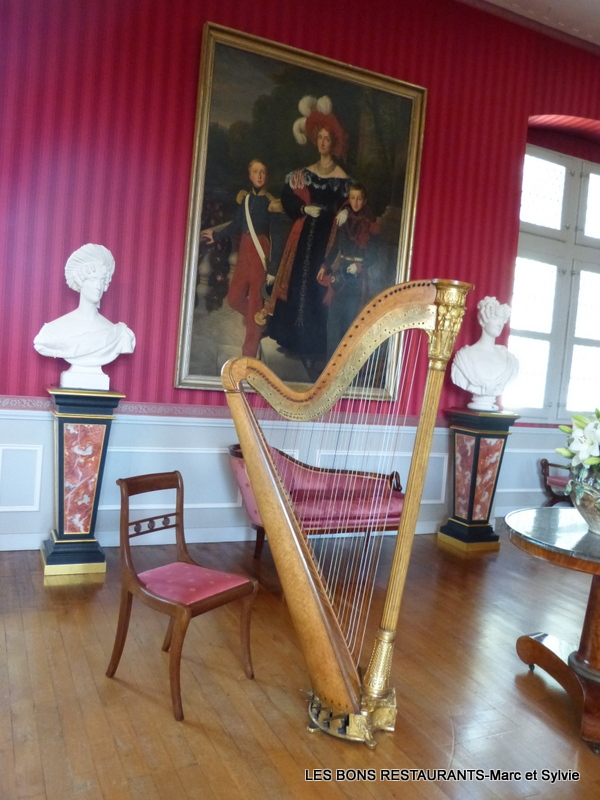 Le château a toutefois été aménagé comme un lieu de villégiature pour la famille d'Orléans. Ce salon de musique rassemble quelques souvenirs de la famille! Vous pouvez voir ou revoir la visite du château d'Amboise depuis le début en cliquant sur ce lien! Cliquez sur les photos pour les agrandir! Le mobilier de ce vaste salon de musique se compose notamment d'un piano à queue Érard en placage de palissandre de Rio du 19e siècle!