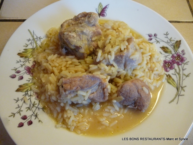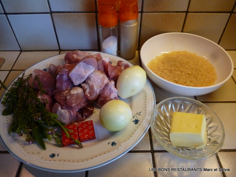 (6 personnes- préparation 15 minutes- cuisson 1h 35) -1kg de porc coupé en morceau -100g de beurre -2 oignons -bouquet garni -2 cubes de bouillon -300g de riz -sel, poivre Pelez, lavez et hachez les oignons.