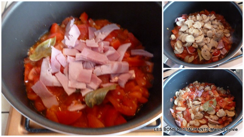 Ajoutez-y l'ail, le jambon et les champignons.