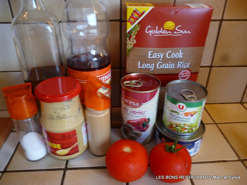 (6 personnes- préparation 5 minutes- cuisson 20 minutes) -100g de riz -2 tomates -1 boîte d'olives vertes -1 petite boîte de macédoine de légumes -1 boîte de crabe -huile d'olive, vinaigre de miel, sel, poivre et moutarde Égouttez la macédoine de légumes, le crabe et les olives.