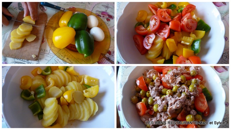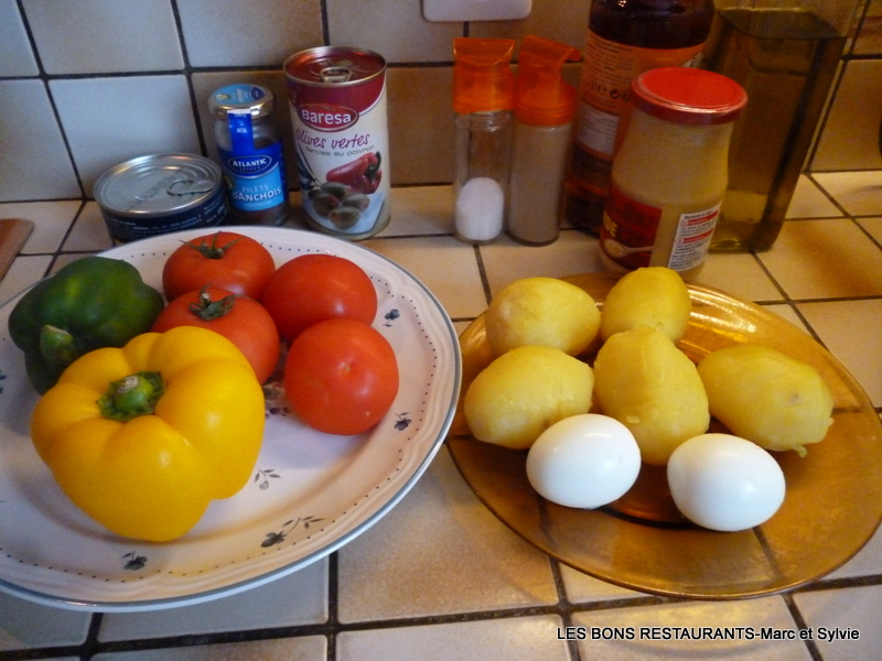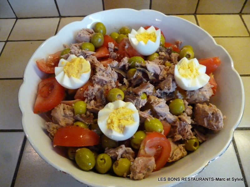 | La salade niçoise, spécialité culinaire célèbre de Nice, est, aujourd'hui, répandue dans le monde entier. Elle constitue l'une des principales entrées proposées en Provence, mais peut constituer à elle seule un repas à part entière. Aujourd'hui, je cuisine une salade niçoise à ma façon! Les ingrédients pour cette recette: (6 personnes- préparation 20 minutes- cuisson 20 minutes) -4 tomates -2 poivrons -4 ou 5 pommes de terre -thon au naturel -4 filets d'anchois -100g d'olives vertes ou noires -2 oeufs -huile d'olive -vinaigre de miel -sel, poivre -moutarde Faites cuire les oeufs dans un grand volume d'eau pendant 10 minutes. Égouttez-les et écalez-les. Faites cuire les pommes de terre dans un grand volume d'eau pendant 20 minutes. Laissez-les refroidir, pelez-les et coupez-les en rondelles. Lavez, épépinez et coupez les poivrons en lanières. Lavez, séchez et coupez les tomates en quartiers. Égouttez les olives. Coupez les filets d'anchois en morceaux. Égouttez le thon. Prenez un saladier et préparez une bonne vinaigrette. Disposez les légumes, les anchois, le thon et les olives. Mélangez délicatement. Disposez les oeufs par-dessus en harmonie. Réservez au réfrigérateur jusqu'au moment de servir! Bon appétit! Vous pouvez retrouver d'autres idées "entrées et salades" sur ce lien.
