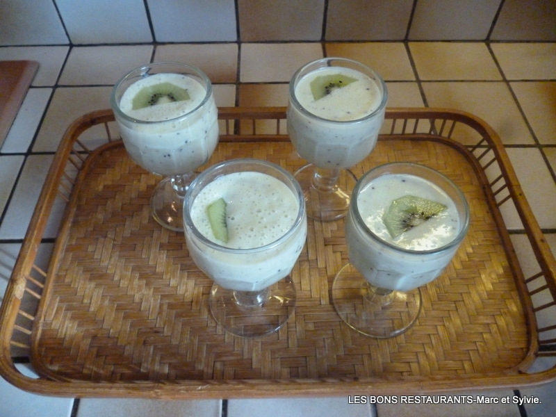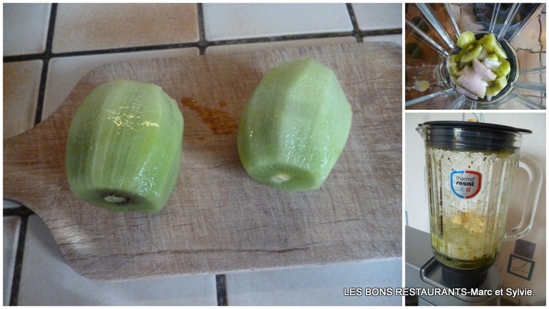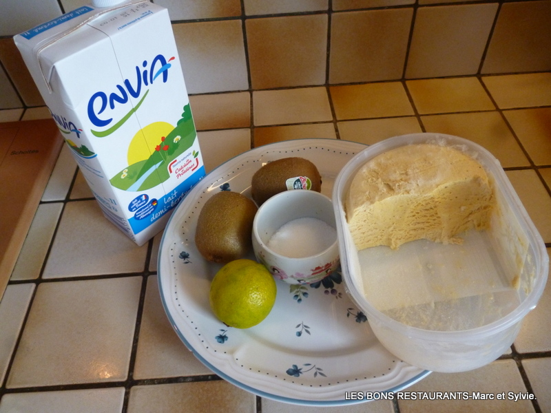 (4 personnes-préparation 5 minutes) -2 kiwis -1 citron vert -200ml lait -1 càs de sucre -2 boules de glace à vanille Bourbon de Madagascar (voir la recette sur ce lien) Pelez, lavez et coupez grossièrement les kiwis.