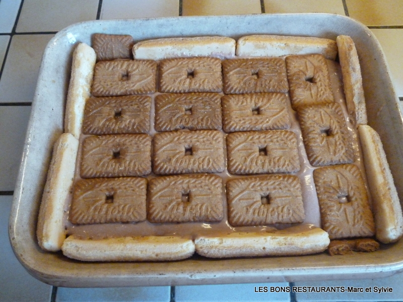 Dans un autre saladier, mélangez le sucre et les jaunes d'oeufs jusqu'à l'obtention d'un mélange mousseux. Ajoutez le mascarpone ainsi que le nutella à cette préparation pour obtenir une crème homogène. Incorporez les blancs en neige. Vous obtenez cette crème onctueuse. Préparez un café fort, ajoutez-y l'alcool et trempez-y les gâteaux. Tapissez le fond et les côtés d'un moule avec les biscuits. Comme je n'avais pas assez de biscuits à la cuillère, j'ai complété avec des spéculoos. Versez la moitié de la crème.