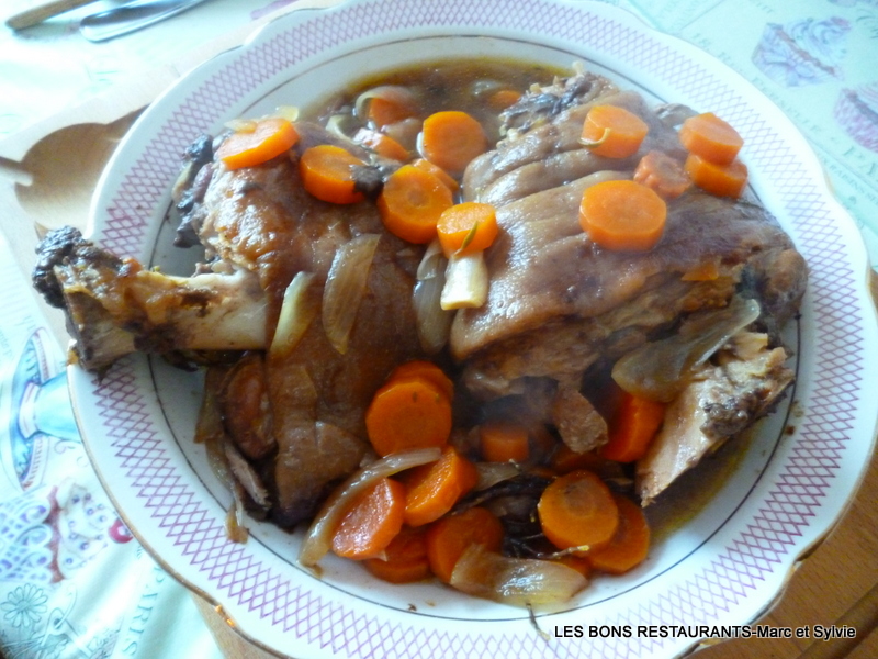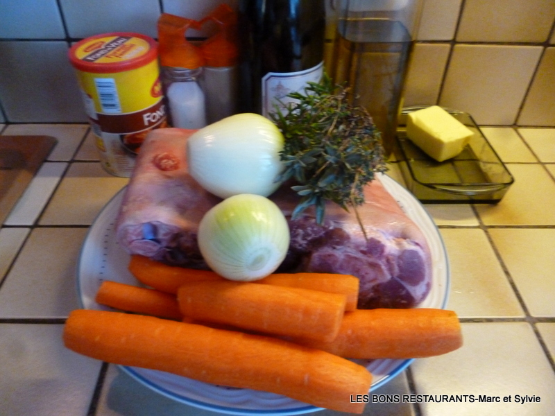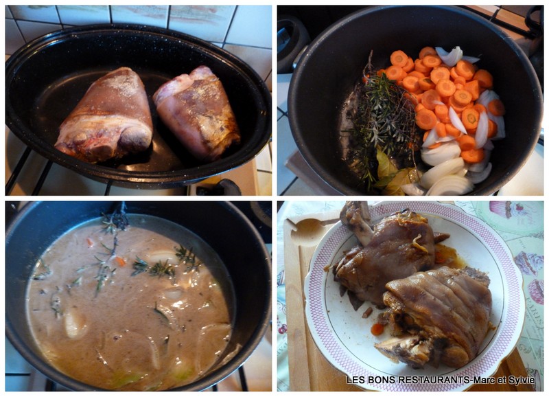 (2 personnes- préparation 20 minutes- cuisson 7 heures) -2 jarrets de porc -2 oignons -6 carottes -1 bouquet garni -50g de beurre -huile d'olive -20cl de vin blanc -1 litre de fond de veau -sel, poivre Pour cette recette, il faut une cocotte qui va sur le gaz et dans le four! Pelez, lavez et coupez les carottes et les oignons en rondelles.