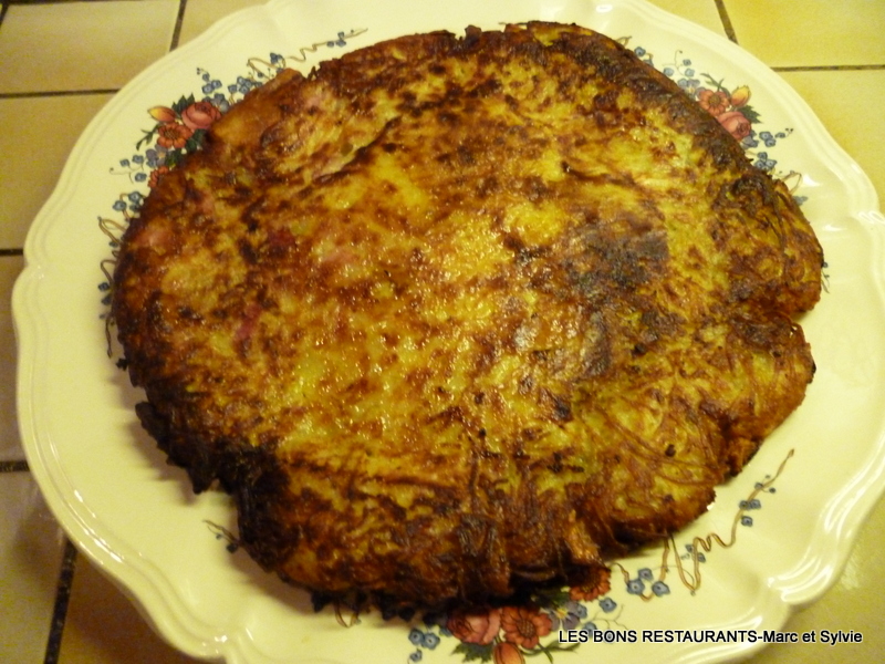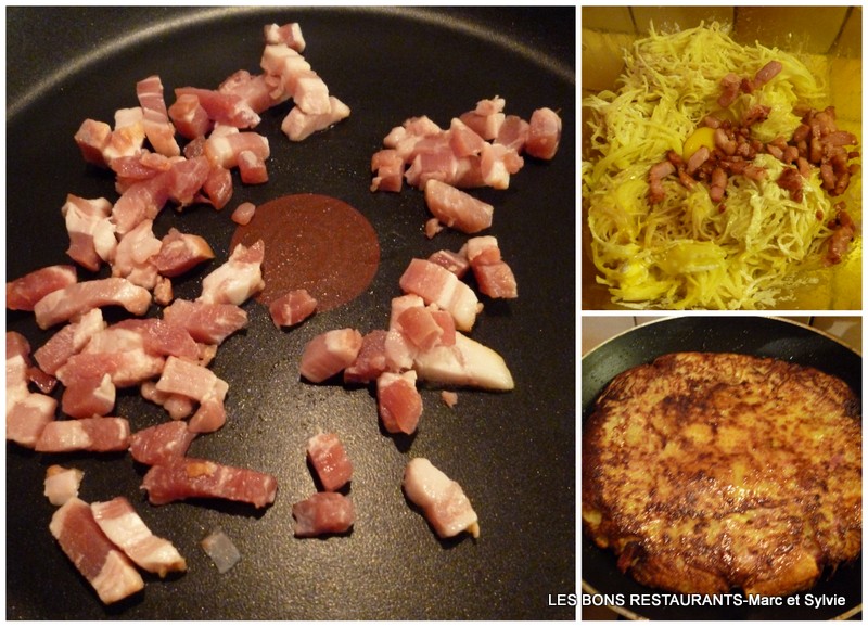 (6 personnes- préparation 10 minutes- cuisson 10 minutes) -1 kg de pommes de terre -2 ou 3 oeufs -100g de farine -1 oignon -100g de lardons fumés -sel, poivre -huile Pelez, lavez et râpez les pommes de terre et l'oignon.