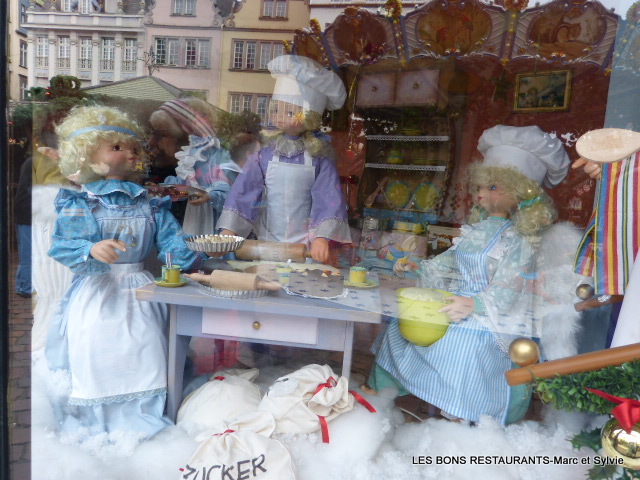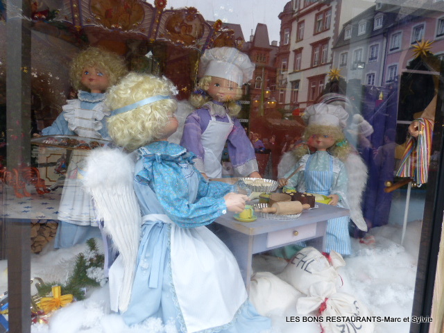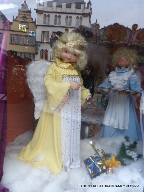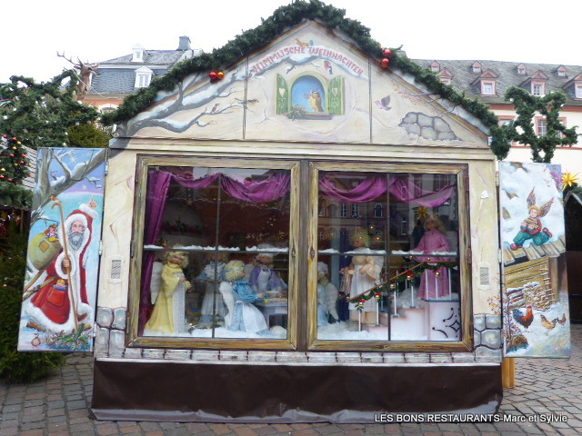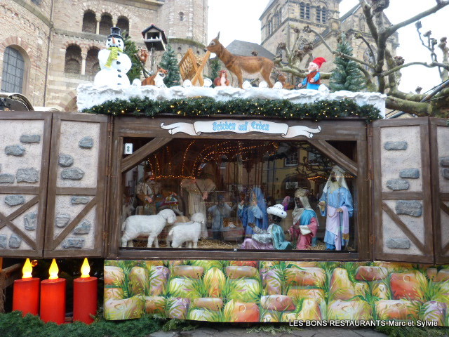 | Le marché de noël de Trèves c'est aussi le marché des enfants, du rêve et de l'imagination! Vous pouvez voir ou revoir notre balade au marché de Noël de Trèves depuis le début en cliquant sur ce lien! Cliquez sur les photos pour les agrandir! (6 clichés) En effet, quelques chalets proposaient de raconter une histoire à l'aide de petits personnages! Les reflets sur la vitre permettent de réaliser des clichés avec les maisons de la place du marché en fond d'écran! On pâtisse....on cuisine! Un second chalet nous présente la famille Sainte! Un dernier petit tour de manège et l'on s'en va!