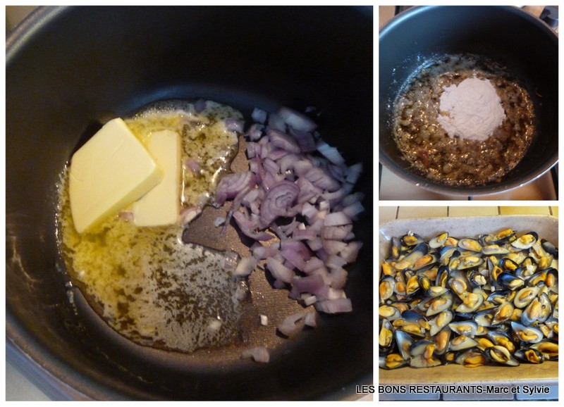 Faites-y revenir les échalotes hachées. Ajoutez la farine. Remuez. Versez le jus de cuisson des moules. Faites cuire à feu doux jusqu'à ce que la sauce épaississe. Ajoutez la crème, le curry et le jus de citron. Répartissez la sauce sur les moules et servez aussitôt!