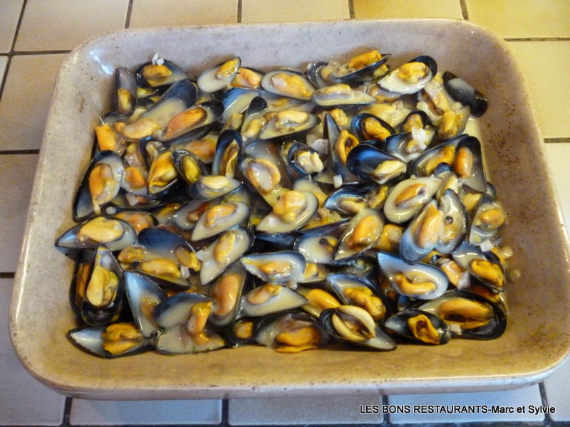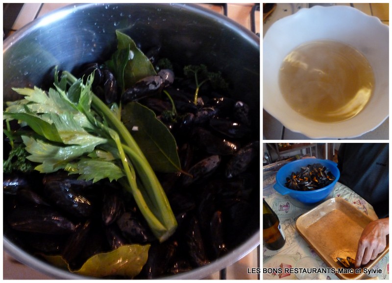 Mettez les moules dans un faitout avec le vin blanc, le bouquet garni et une gousse d'ail pelée et écrasée. Couvrez et faites ouvrir les moules à feu vif! Dès qu'elles sont ouvertes égouttez-les et retirez une coquille à chaque moule. Réservez le jus de cuisson. Disposez-les dans un plat.