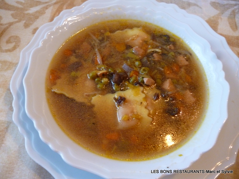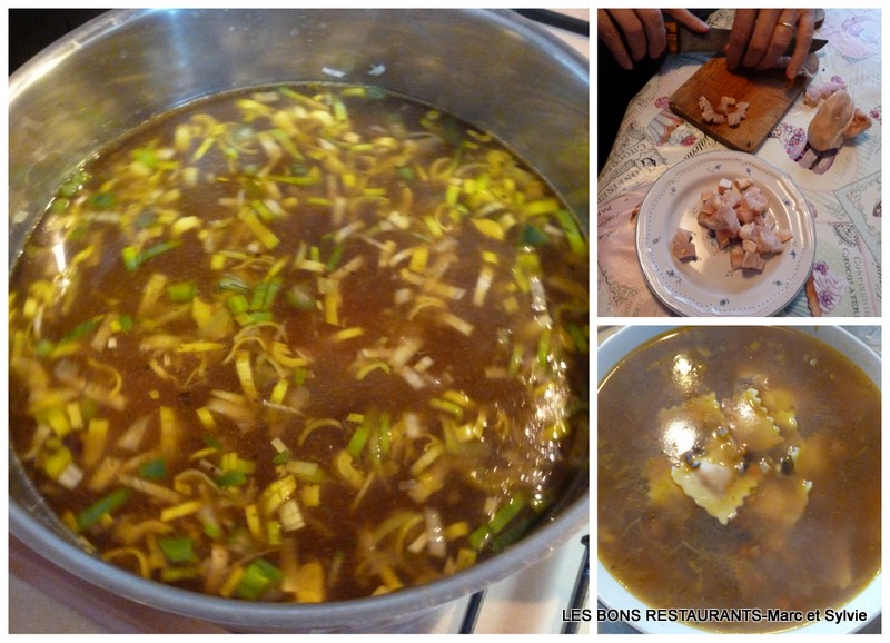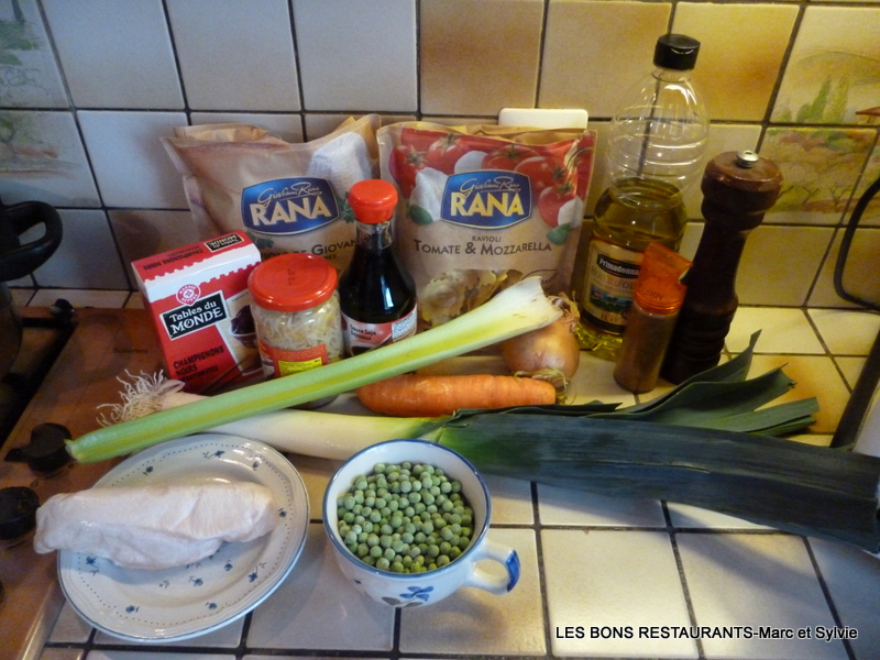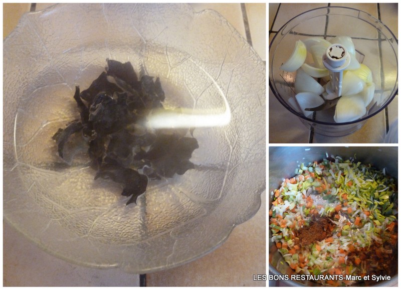 (6 personnes- préparation 20 minutes- cuisson 30 minutes) -200g de blanc de volaille -4 càs de sauce soja -15g de champignons noirs séchés -1 oignon -1 bol de petits pois surgelés -1 carotte -1 poireau -1 branche de céleri -50g de germes de soja -1 càs de curry -huile d'olive -1 paquet de ravioles Faites tremper les champignons noirs dans un saladier d'eau bouillante.