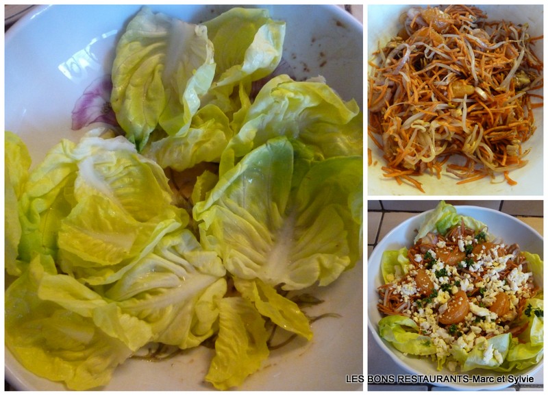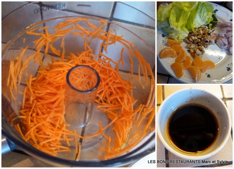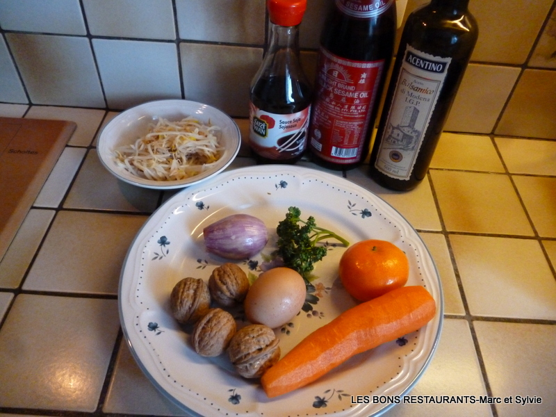 (4 personnes-préparation 15 minutes) -1 bocal de pousses de soja -5 ou 6 noix -1 carotte -1 mandarine -1 échalote -1 oeuf -1 coeur de laitue -1 càs de sauce soja -1 càs d'huile de sésame -1 càs de vinaigre balsamique -persil Pelez, lavez et râpez la carotte.