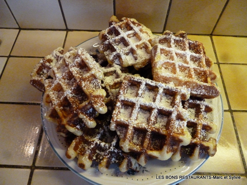 Ajoutez-y 2 càs d'eau tiède. Laissez reposer 15 minutes. Prenez un saladier et versez-y la farine. Ajoutez-y la levure délayée, le beurre fondu et le sucre semoule. Faites chauffer le lait et ajoutez-le dans la préparation précédente en mélangeant bien. Ajoutez les oeufs un à un en travaillant bien le mélange. au fouet. Huilez votre gaufrier et faites-le chauffer comme à votre habitude. Versez de petites louches de pâte. Préparez les gaufres comme à votre habitude et enlevez-les lorsqu'elles sont bien dorées. Posez les gaufres sur une grille pour les refroidir, saupoudrez-les de sucre glace et....dégustez!
