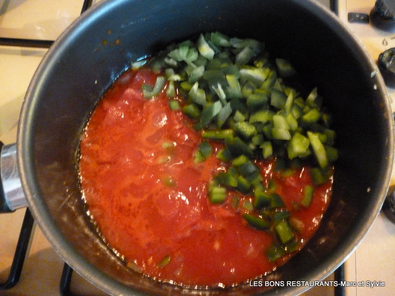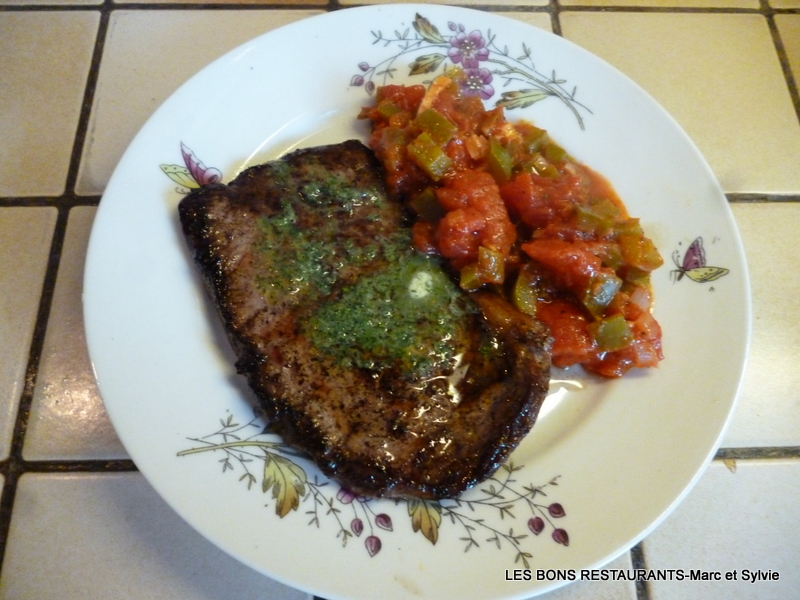 (2 personnes-préparation 10 minutes- cuisson 15 minutes) -2 biftecks -300g de tomates pelées -2 poivrons -1 échalote -1 gousse d'ail -herbes de Provence -sel, poivre -huile d'olive Lavez, épépinez et coupez les poivrons en petits dés.