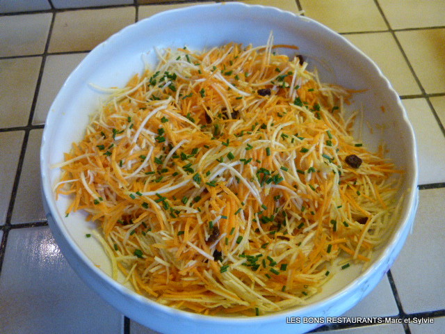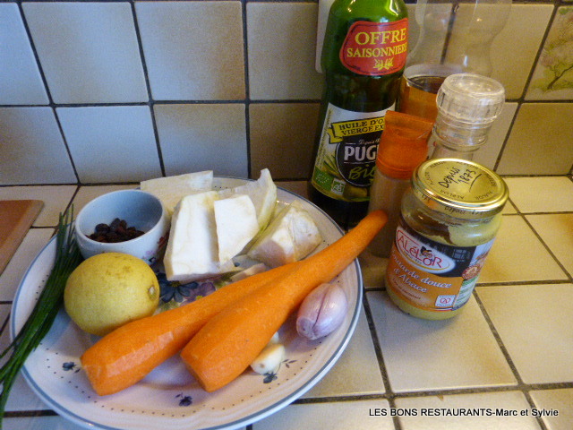 (4 personnes- préparation 15 minutes) -100g de raisins secs -400g de carottes -1 petit coeur de céleri -huile d'olive -vinaigre -moutarde -sel, poivre -ciboulette -1 ail et 1 échalote Commencez par faire tremper les raisins dans de l'eau tiède.