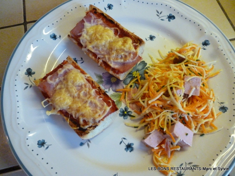 (2 personnes- préparation 5 minutes- cuisson 5 minutes) -1/2 baguette -4 tranches de jambon -fromage râpé -1 petite boîte de sauce tomates Posez une feuille de cuisson sur la plaque du four.