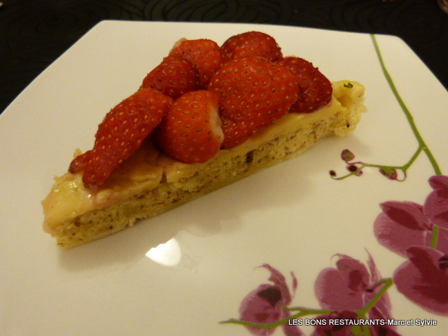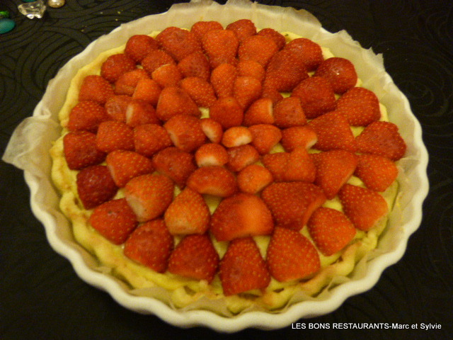 Sur une pâte sablée, Rita a disposé un appareil à base d'amandes en poudre. Et c'est sur un lit de crème pâtissière que les fraises ont été rangées!