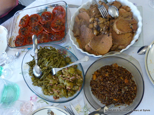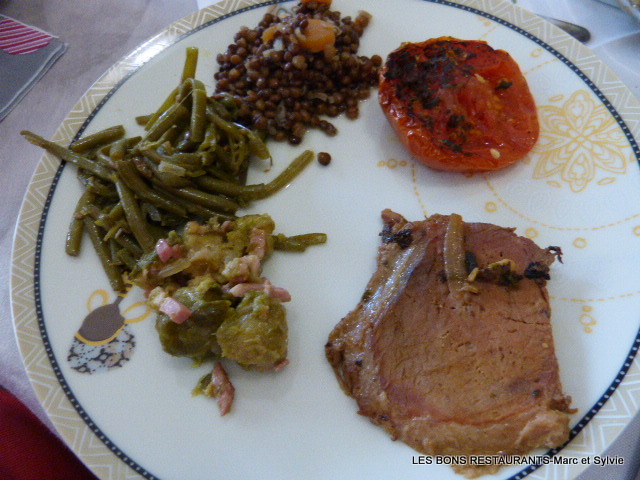 Les légumes sont les rois du repas....haricots verts, choux de Bruxelles aux petits lardons, potée de lentilles aux carottes et tomates provençales.
