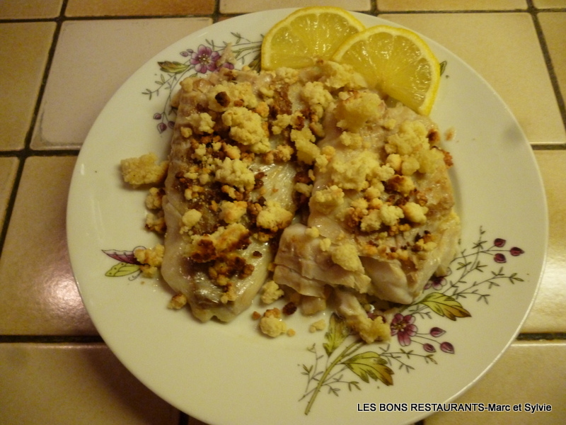 (4 personnes- préparation 25 minutes- cuisson 10 minutes) -2 beaux dos de cabillaud -40g de beurre -sel -50g d'amandes en poudre -50g de farine -50g de beurre froid -1 citron Préparez le crumble!