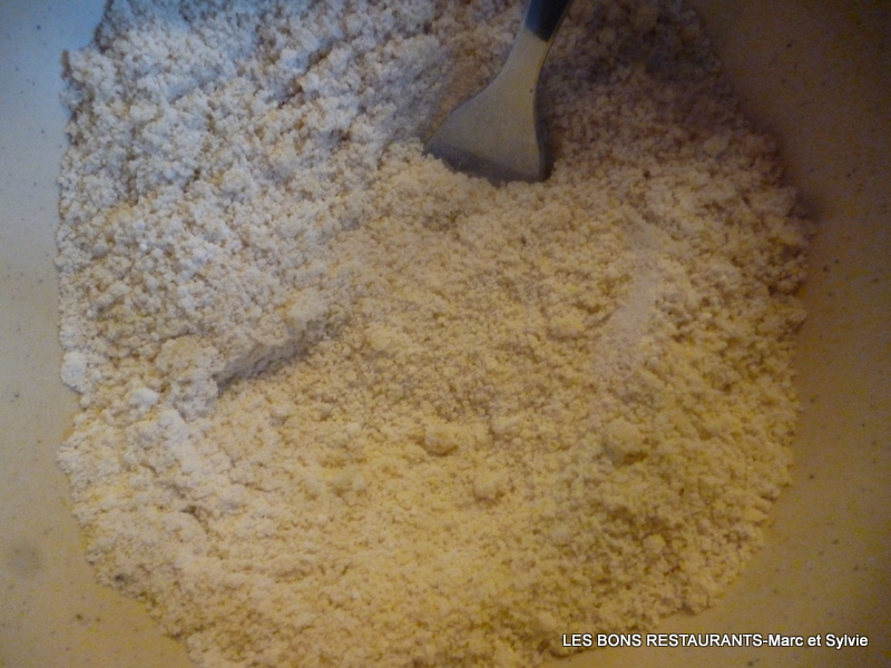 Mélangez la farine et la poudre d'amandes. Pelez et coupez un citron et ajoutez-le à la préparation précédente ainsi que le beurre froid.