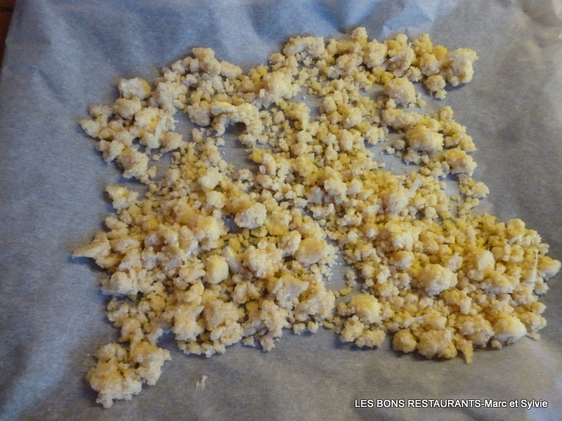 Mélangez du bout des doigts afin d'obtenir des petites miettes. Placez le crumble sur une feuille de papier sulfurisé sur la plaque du four.