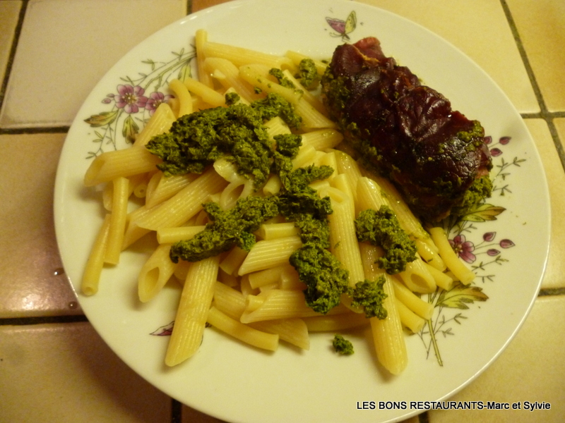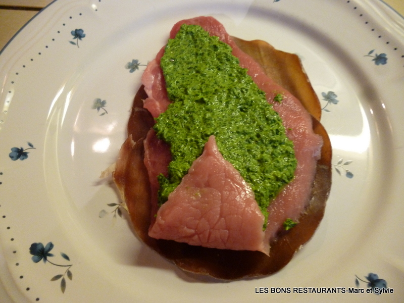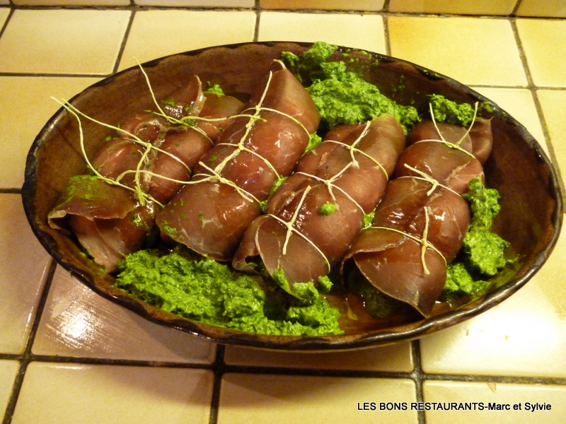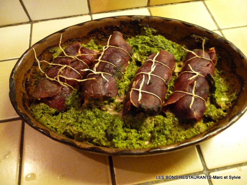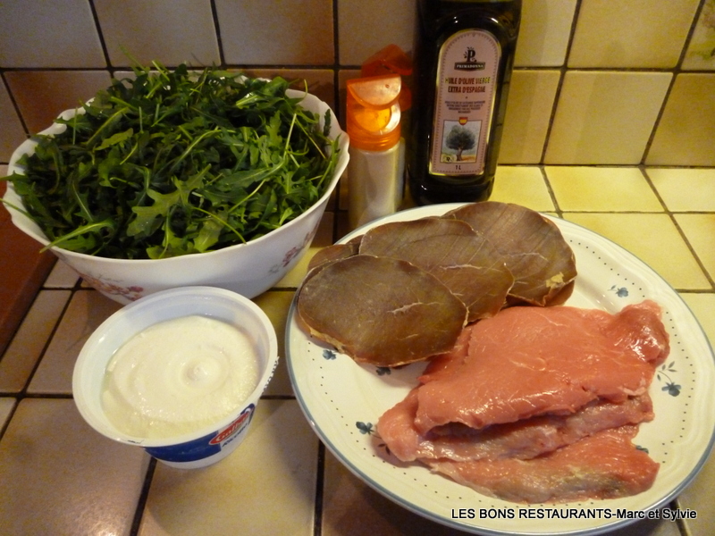 (4 personnes- préparation 30 minutes- cuisson 20 minutes) -4 tranches fines de veau -4 tranches de bresaola ou des tranches de lard fumé -100g de ricotta -300g de roquette -huile d'olive -sel, poivre Lavez et séchez la roquette.