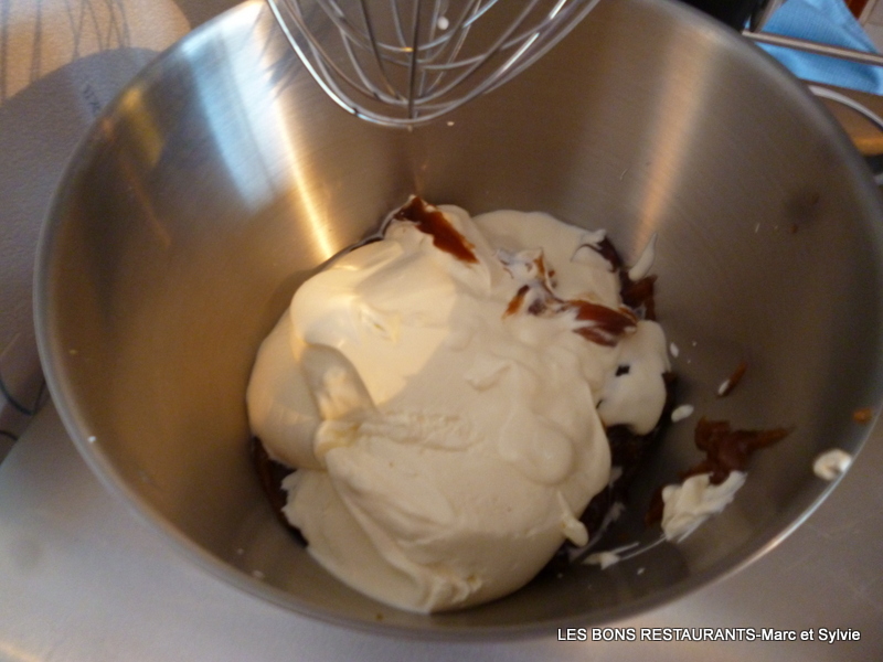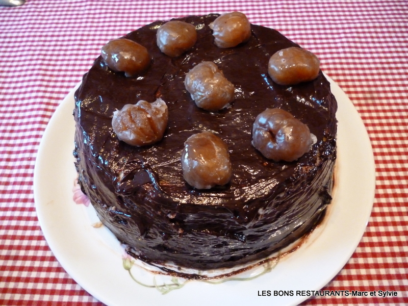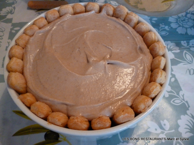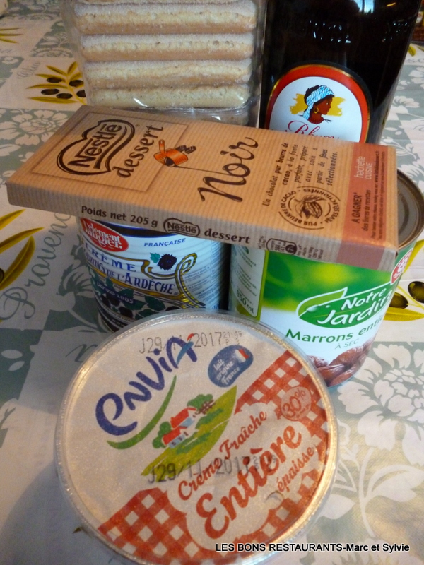 (8 personnes- préparation 30 minutes- attente 12 heures) -biscuits à la cuillère -750g de crème de marrons -500g de crème fraîche entière -200g de chocolat noir pâtissier -2 càs de rhum -quelques marrons glacés pour la décoration Battez au fouet la crème de marrons et la crème fraîche.