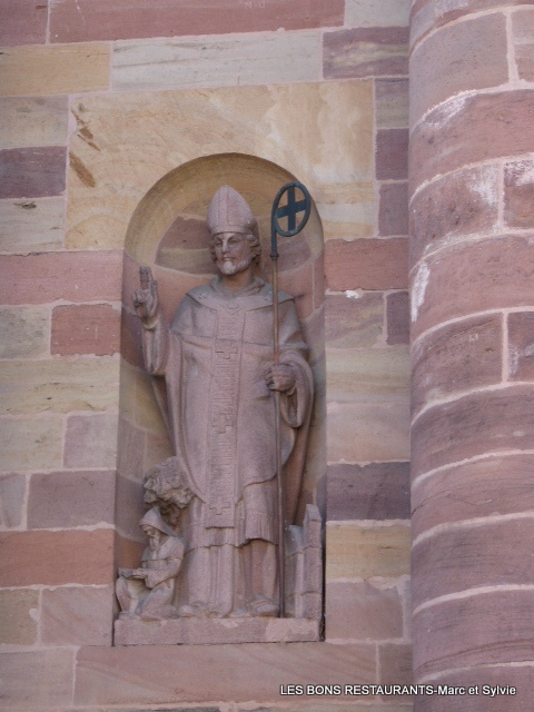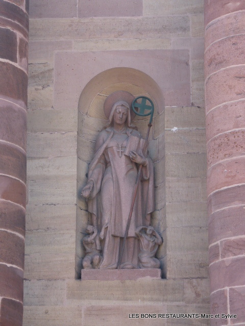 Outre 4 colonnes doriques, la façade, monumentale, accueille les statues de Sainte-Odile et Saint -Arbogast. Le clocher, conservé de la précédente église, date du 13è siècle.