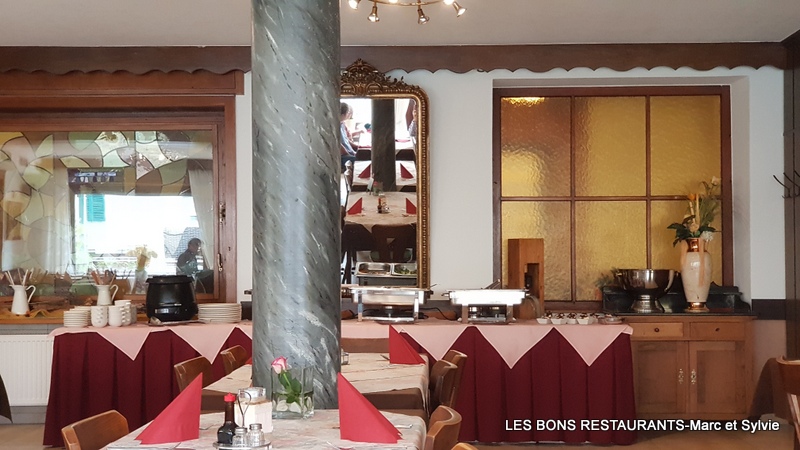 Nous sommes accueillis bien sympathiquement et nous nous installons dans la salle du restaurant au décor bien agréable.