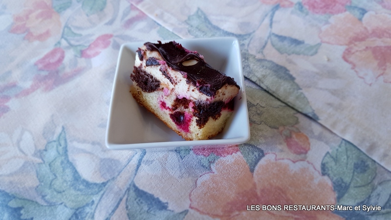 Le dessert du jour est un biscuit aux fruits recouvert de mousse! Un petit délice!