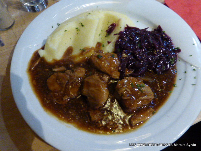 Le plat de résistance est composé d'un ragoût de porc! Il est accompagné d'une purée maison et d'un potée de chou rouge.