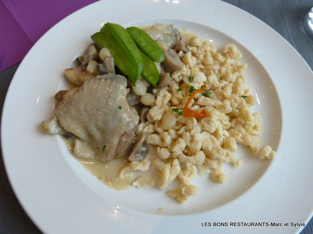 Le plat de résistance est composé de poulet fermier au Riesling. Il est bien sûr accompagné de Spaëtzle maison et de légumes.