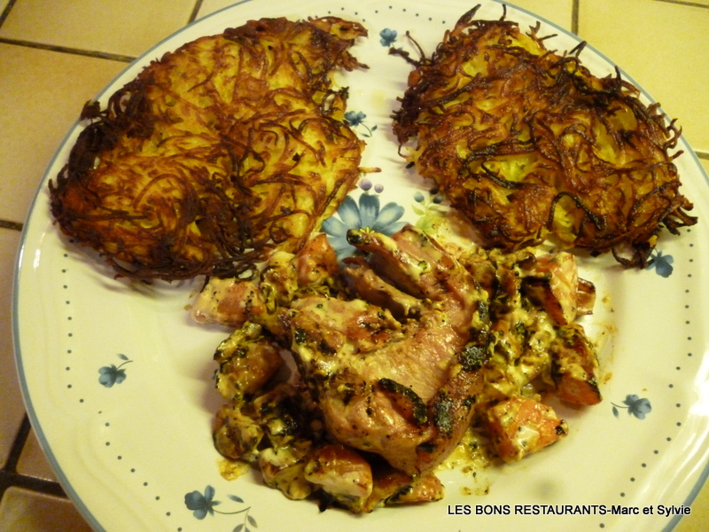 Remuez! C'est prêt! J'ai servi mes côtes de porceletet à la crème de moutarde avec des pommes de terre râpées!