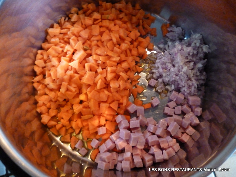 Faites revenir carottes, ail, échalote et jambon dans une cocotte avec un filet d'huile d'olive pendant quelques minutes.