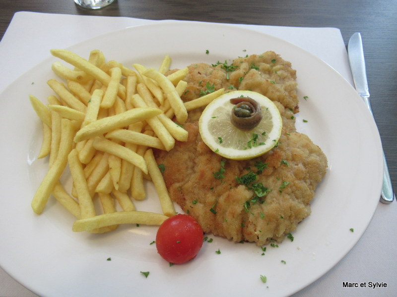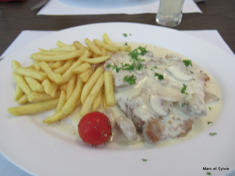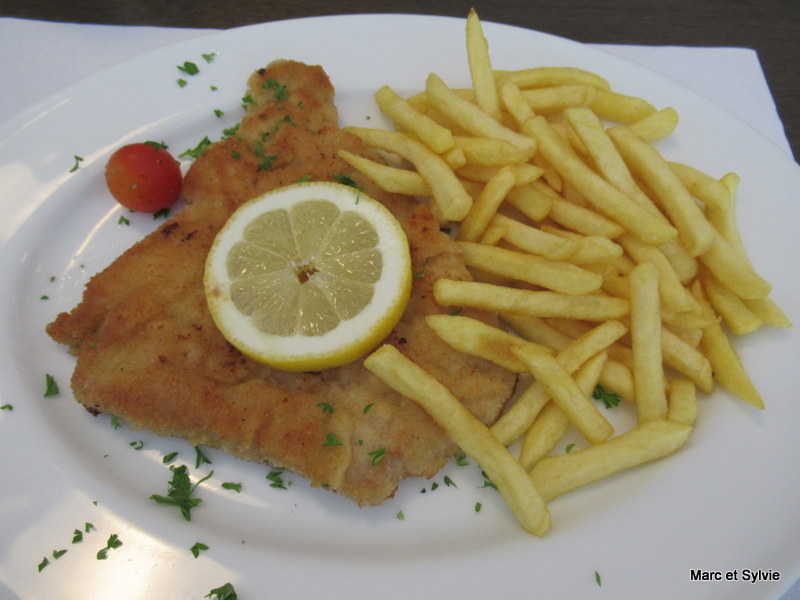 Pour ma part, je reste classique avec une escalope panée. Nos plats sont accompagnés de frites! Que dire de plus!