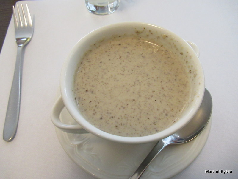 Aujourd'hui, un potage aux champignons! Cela vous dit? Nicolas poursuit avec une escalope de veau viennoise. Toujours aussi délicieux.