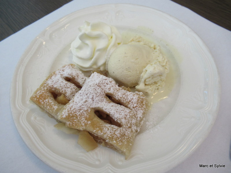 Marc et Nicolas ne terminent jamais un repas sans un bon dessert! Pour Marc, ce sera un apfelstrudel, ou strudel aux pommes, servi avec une boule de glace à la vanille et un peu de crème chantilly.