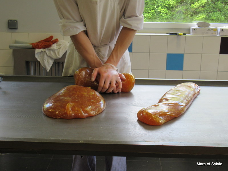 Il faut alors façonner des pains afin de pouvoir les passer dans la "machine à bonbons"! La pâte passe alors dans un cylindre en bronze.