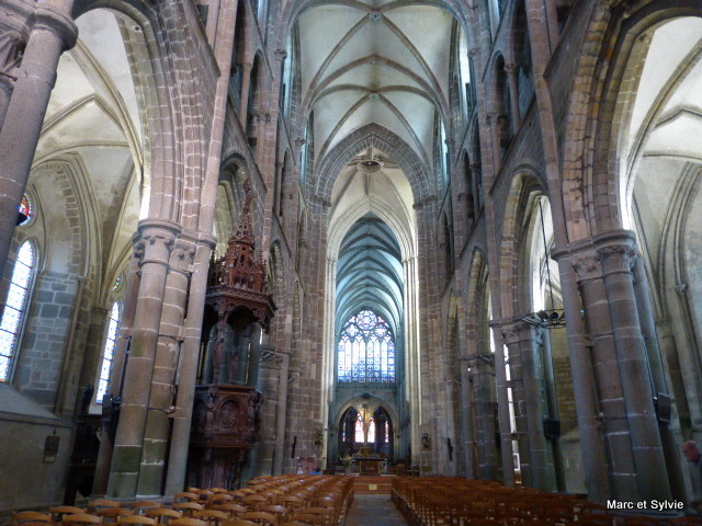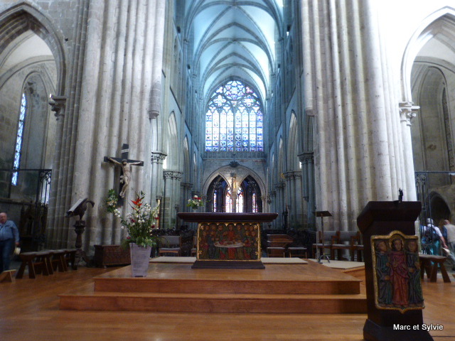 L'intérieur est formée de sept travées à trois étages. Comme dans d'autres cathédrales des styles roman et gothique normand, une galerie de circulation est aménagée au niveau des fenêtres hautes, à leur base.